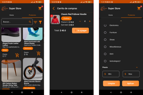 He creado una app ecommerce de demostración llamado Super Store, que muestra mi habilidad para implementar estructuras de código sólidas en Kotlin.